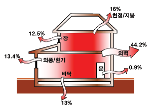 그림에서 보여지는 것과 같이 실제로 건축물의 구조상 가장 많은 열손실이 이루어지는 곳은