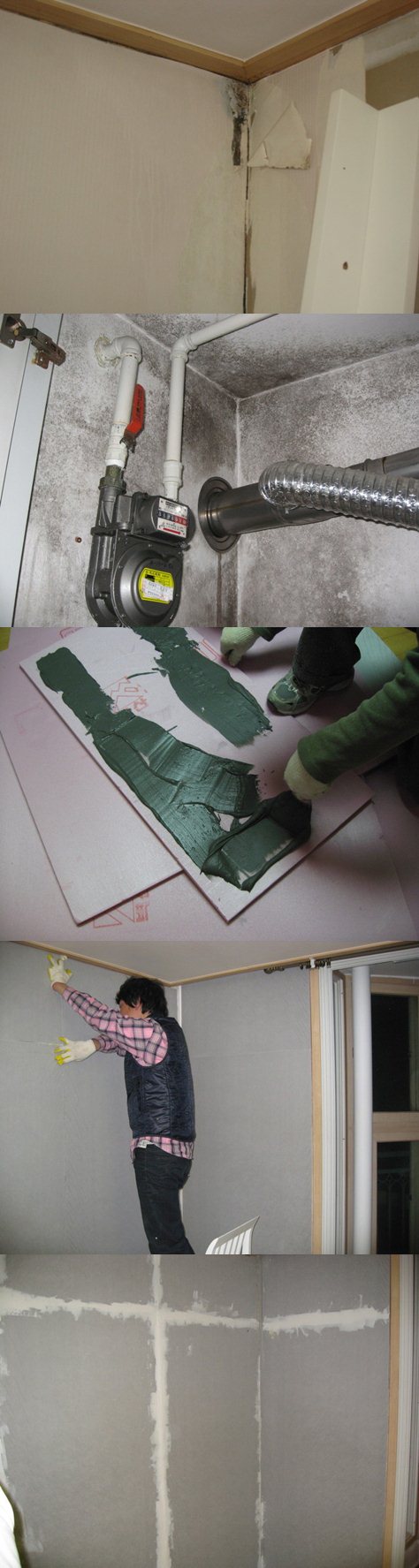이제 본격적으로 e-board를 시공하는 모습입니다. 단열과 결로 예방의 첨단공법입니다. 벽면의 사이즈에 맞게 컷팅후 접착제 도포,,냄새도 좋습니다. 모두 시공후 틈새를 메꾸워주는 퍼팅작업~